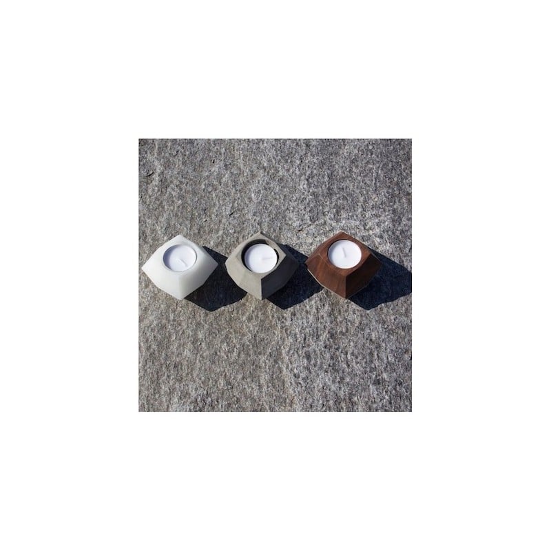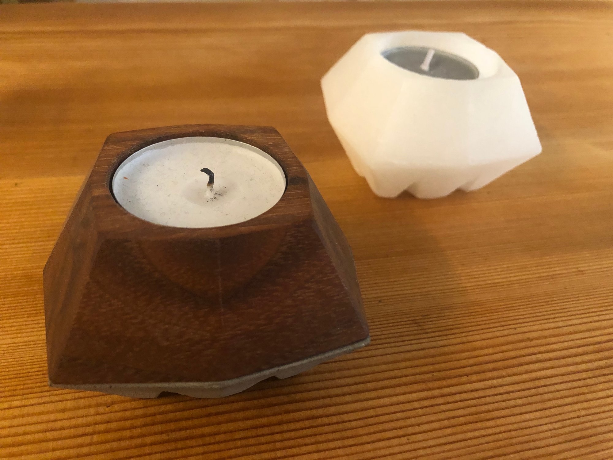 Kerzenständer wird mit einem Röschökerzli bestückt. Es gibt drei Versionen Wachs, Beton und Holz/Beton